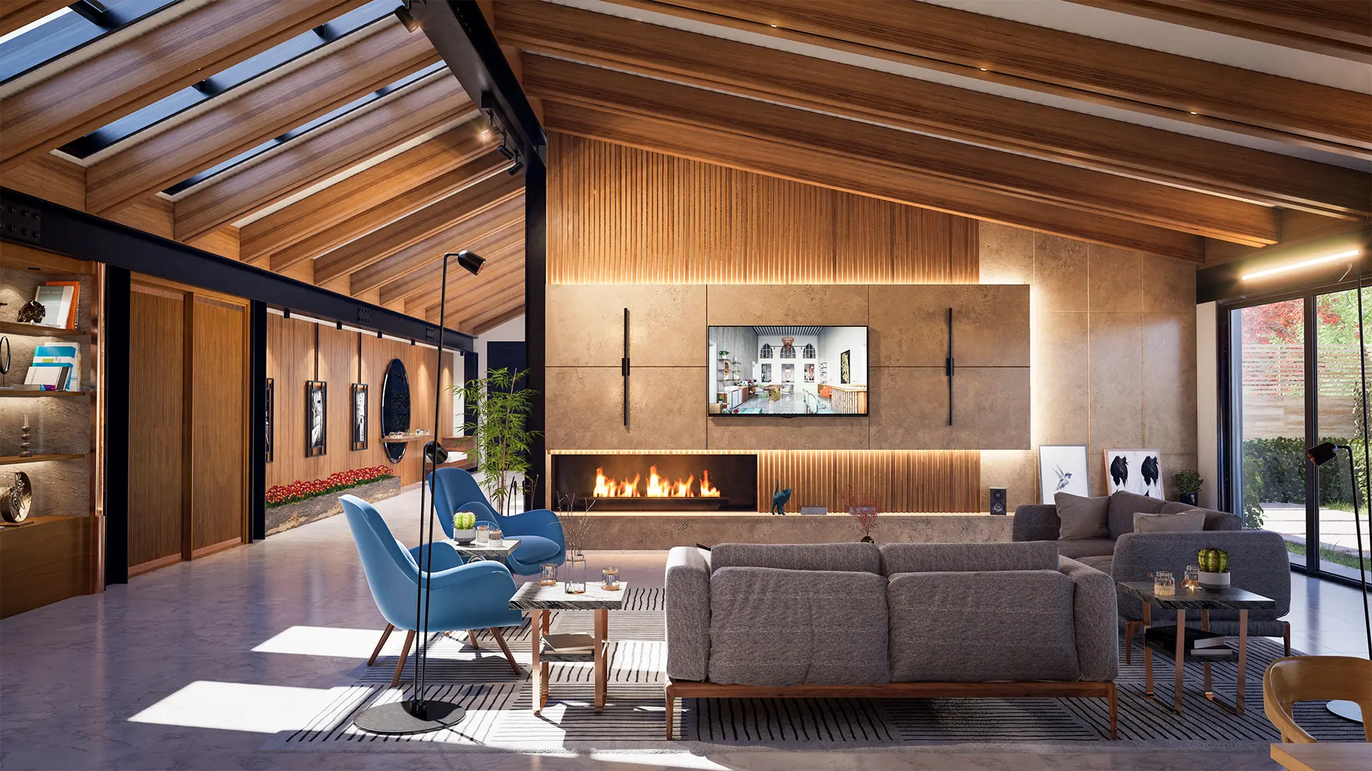 A modern residence defined by sweeping skylights, warm timber accents, and seamless indoor-outdoor flow, built as a fully interactive real-time experience in Unreal Engine. Delivered via cloud streaming to any device, users navigate the complete property with touch controls. The experience features real-time material swaps, marble to herringbone wood, dynamic time-of-day lighting, and an empty shell mode that strips interiors to expose the raw architectural volumes. Designed as a collaborative tool for architects and clients to explore, customize, and validate design decisions inside a digital twin; no downloads, no hardware limits.